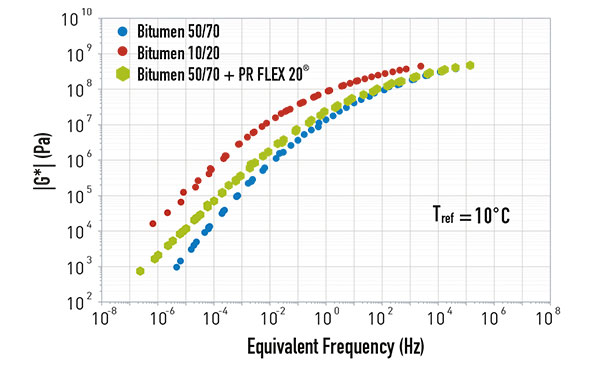 Study of the complex shear modulus on two straight bitumen and one bitumen with 6% PR FLEX 20®.